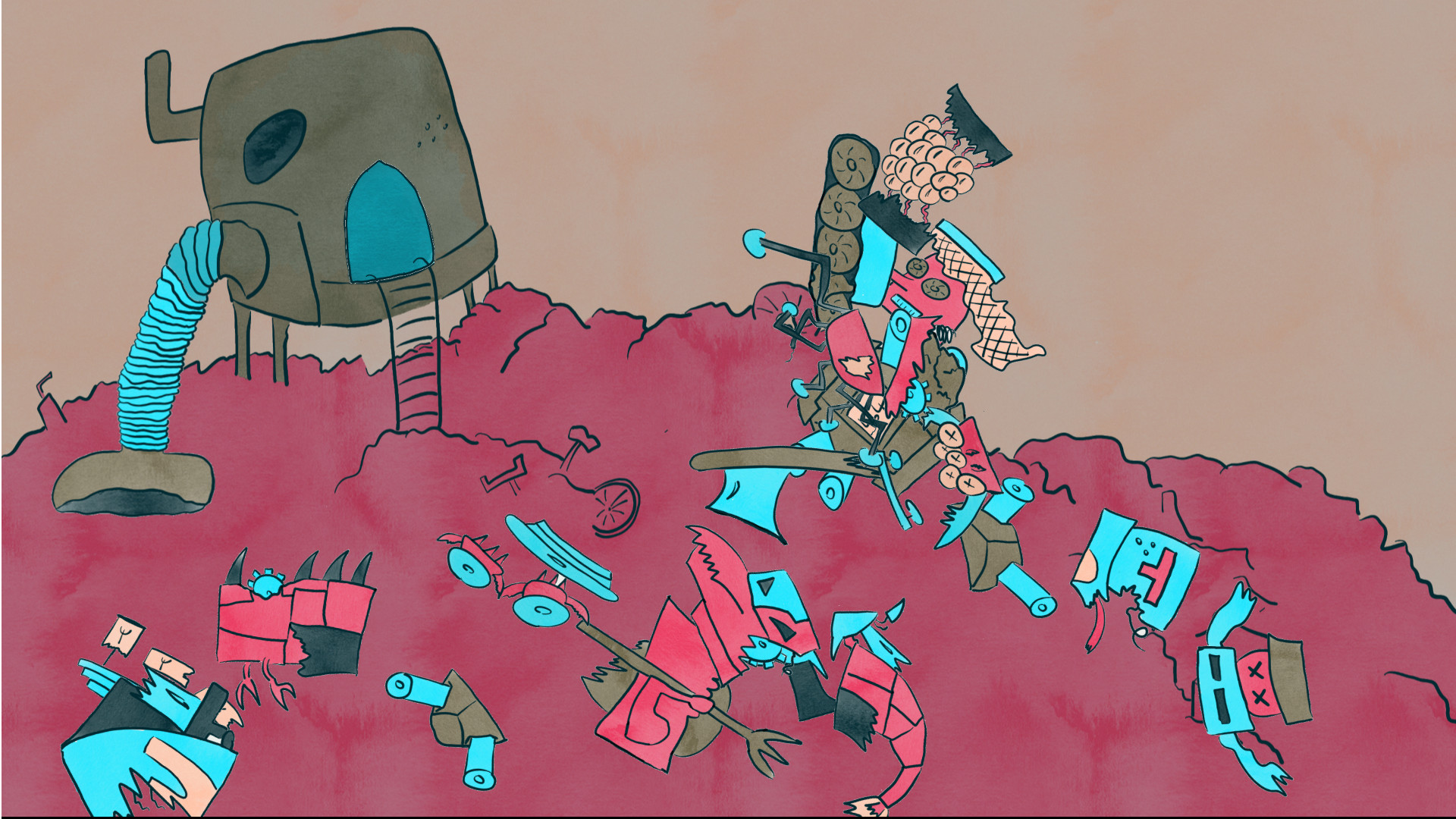 Luckily, there's a huge junkyard just outside the door, filled with pieces of all the destroyed Super Killer Robots. Put them in your Vacuumer(tm) to bring them one at a time into your workshop and try what they sound like. And if you don't like a sound in your loop, just put the part back in the trash where it belongs.